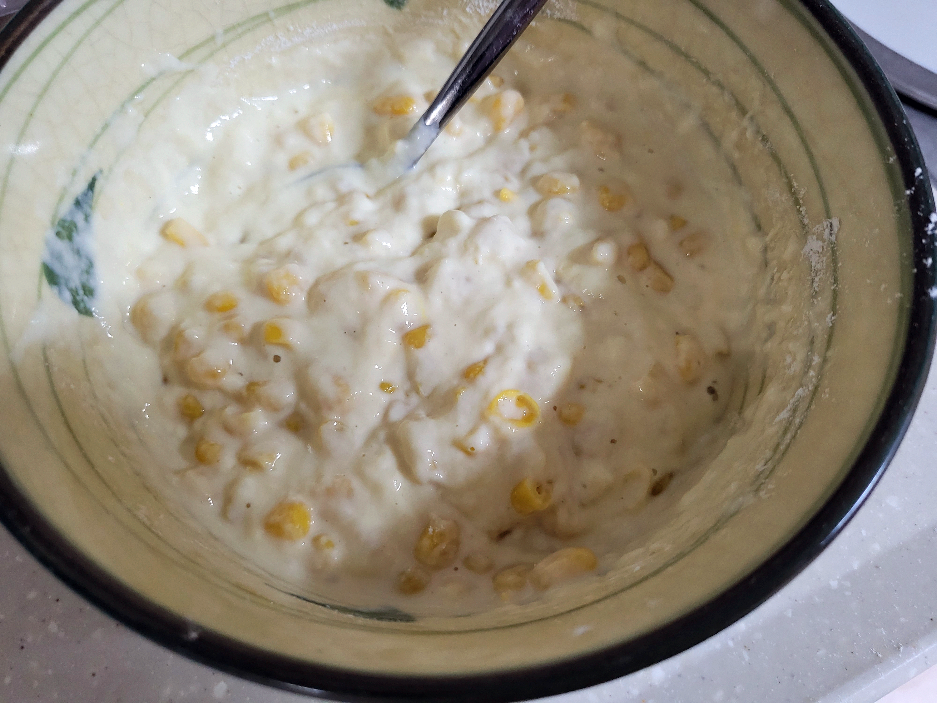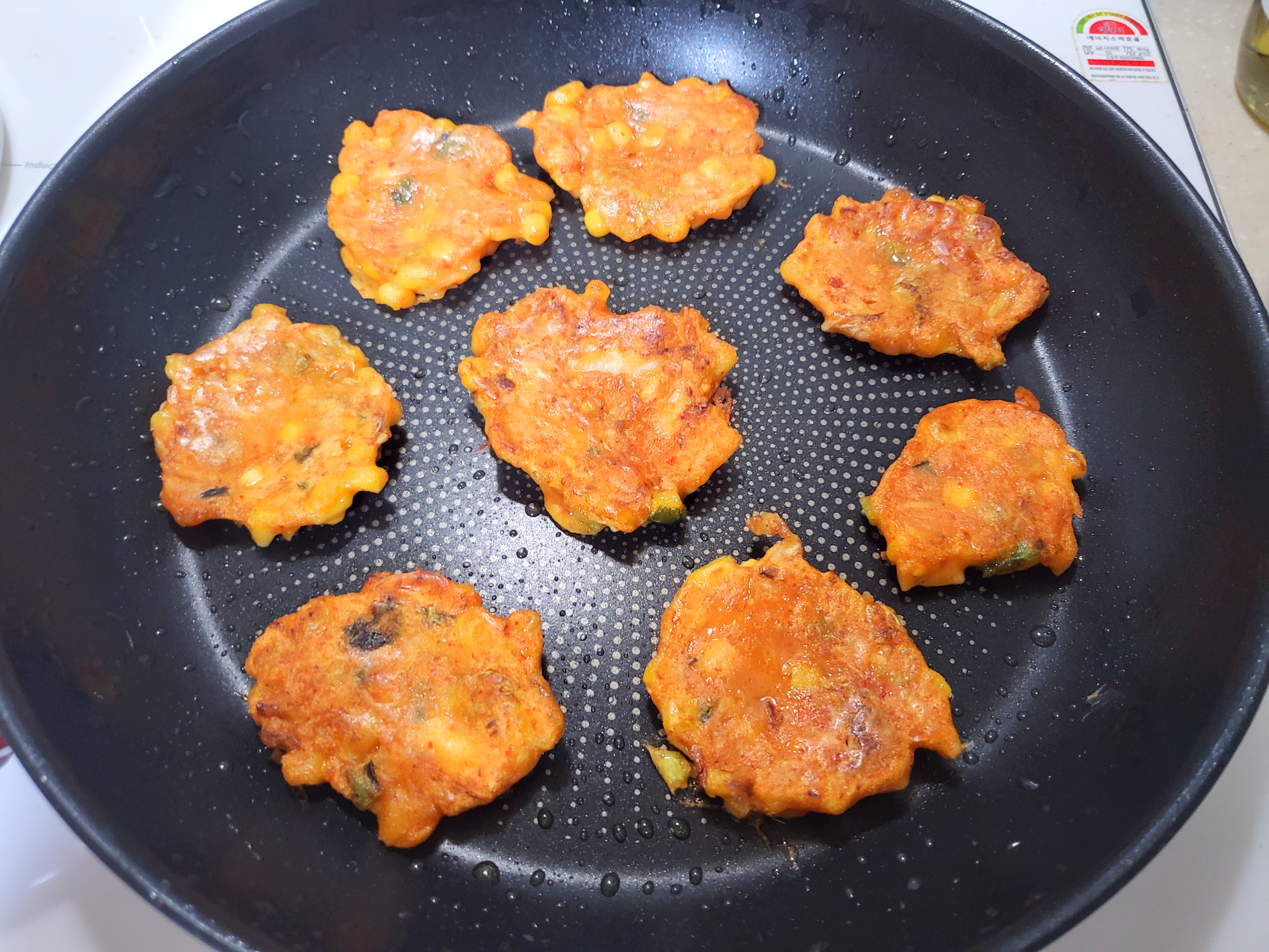1. 반죽에 옥수수, 다진 김치, 고춧가루를 넣고 섞는다.